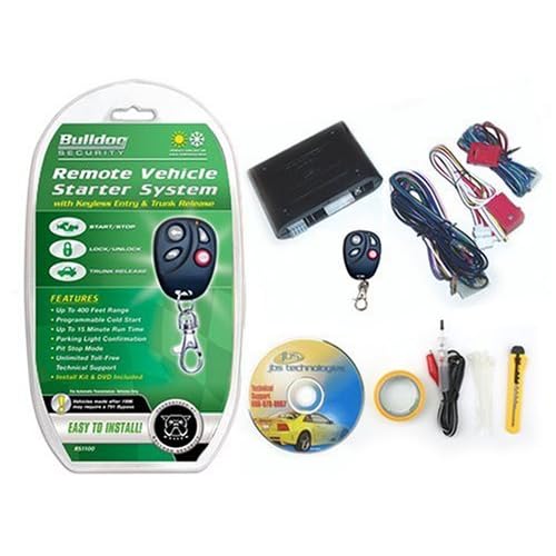 The Bulldog Security RS-1100 Remote Starter with keyless entry and trunk release has a 4 button O.E.M. look-a-like transmitter with a range of over 400 feet. All the relays are built in for door locks, trunk release, dome light, and parking light so no additional relays are necessary. With a dedicated "START" and "STOP" button there is no confusion on how to start or stop the vehicle, and it also features programmable run times of 5, 10, or 15 minutes. Additionally, the ability to program it for "cold starts" allows you to set a certain temperature to start the vehicle in cold weather from 400 feet away. The "pit stop" feature lets you to stop for coffee or the paper without turning off the vehicle, while protecting it from being stolen. Also includes an easy to follow do-it-yourself instructional DVD and 24/7 web site support.